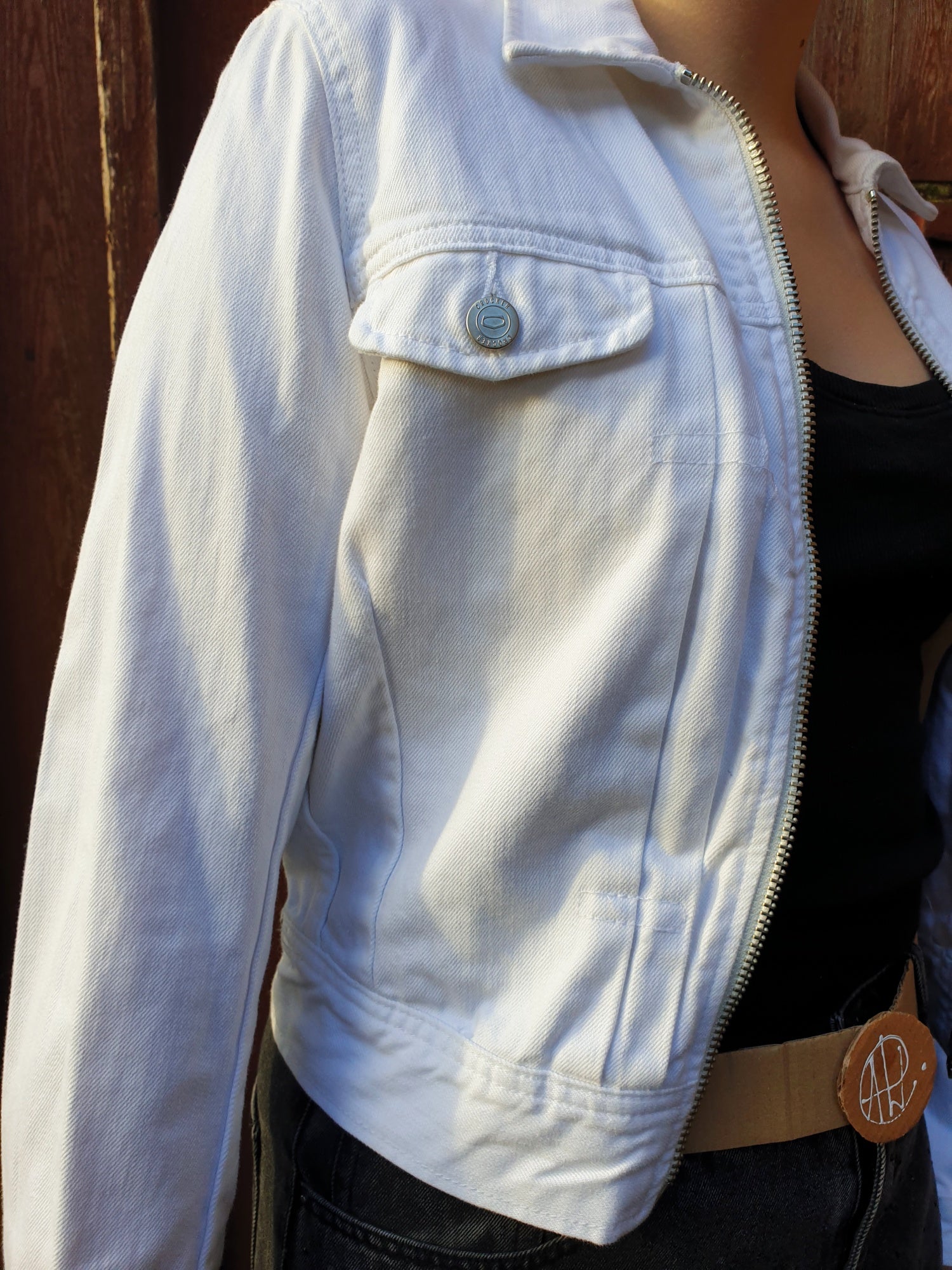 This slightly shorter white cotton jacket looks sharp and minimal from the front — zip closure, two chest pockets, and subtle pleats that shape the fit — but the back tells another story. A striking black-and-red portrait stares right through conformity, reminding everyone that fashion can have a pulse, a glitch, and a personality.